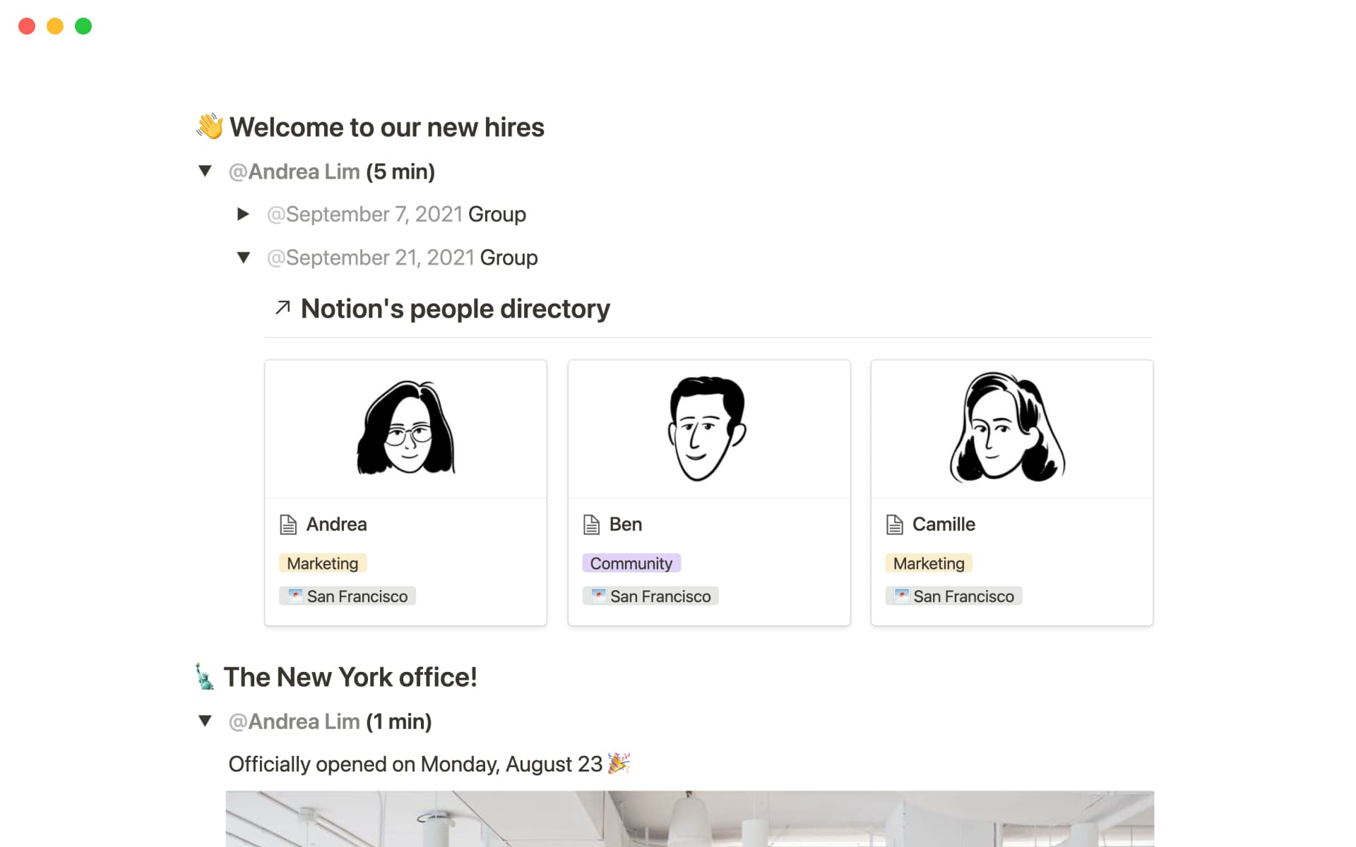 Instead of tossing around Powerpoint files or struggling with formatting in Google Slides, we use a Notion page. We've found it makes the presentation incredibly interactive — if the product team is demoing a new feature, they can link to the product spec and drop in a quick GIF. To introduce new teammates, we just embed our People directory directly into the page.